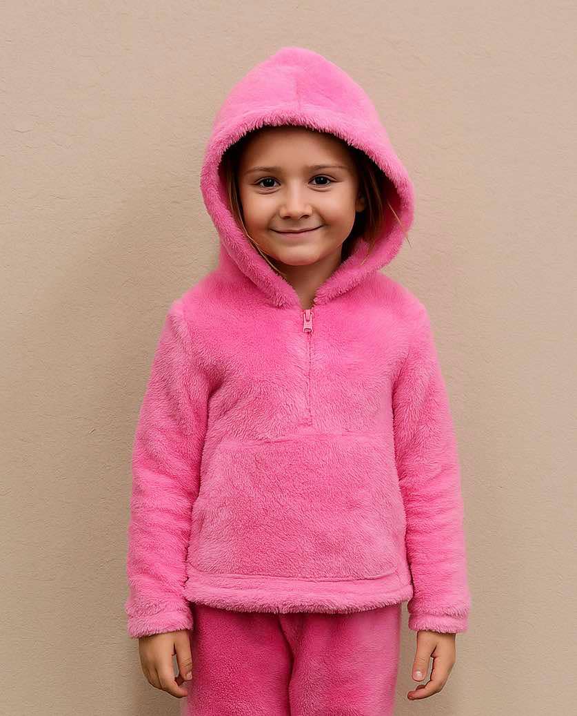 This pink snow fleece hoodie is the ultimate cozy essential for your girl. Buttery-soft fabric wraps her in warmth and comfort, perfect for lazy days or outdoor adventures. The cheerful pink hue pairs beautifully with our matching pants for a coordinated set she'll actually want to wear. Soft, stylish, and oh-so-snuggly!