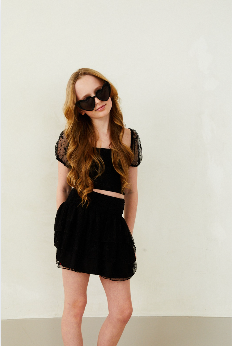 The Noa is classic T H E M E. We love the tie back fit of this top - makes it the perfect fit for everyone. Now in mesh with gorgeous bows! Wear it on and off the shoulder.