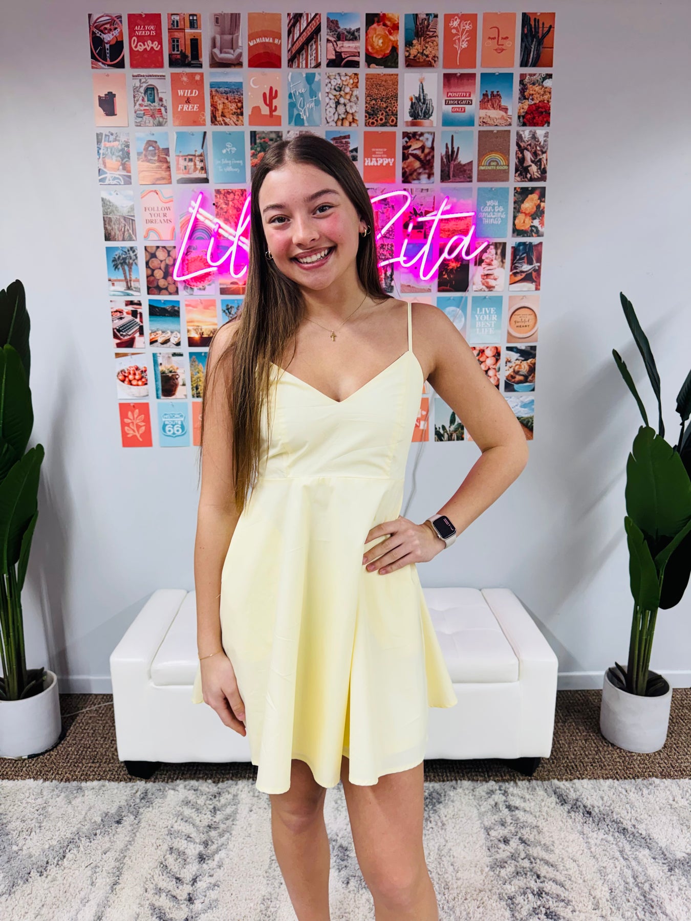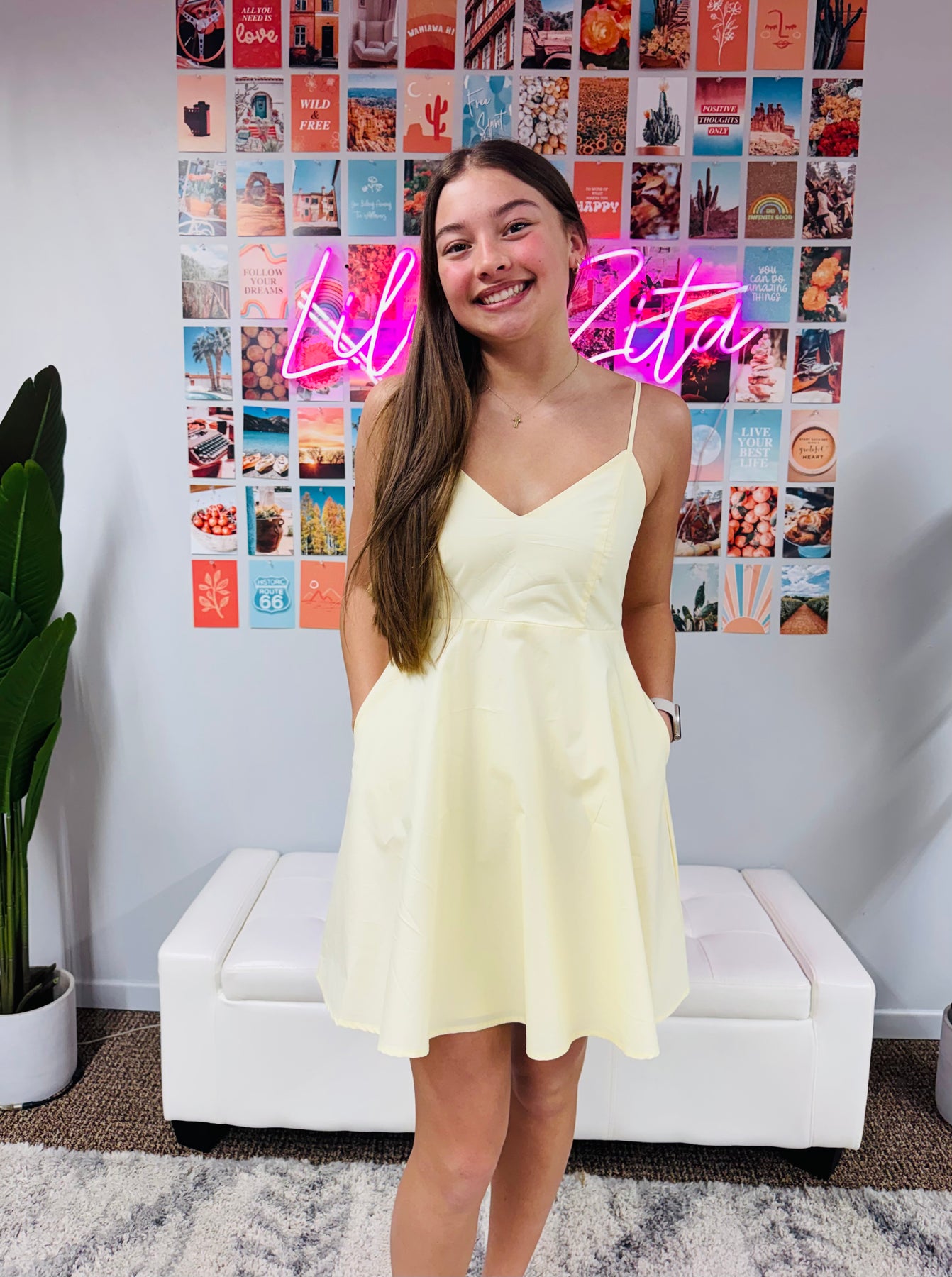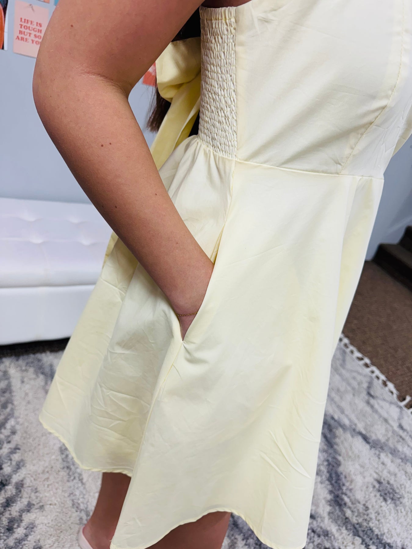 Twirl-ready style meets everyday comfort in this charming mini dress. The smocked back with a delicate bow adds a touch of whimsy, while the flared silhouette and spaghetti straps create a flattering, breezy look. Practical side pockets keep your essentials close. Crafted from a soft cotton-polyester blend, it's perfect for warm-weather adventures and special occasions alike.
