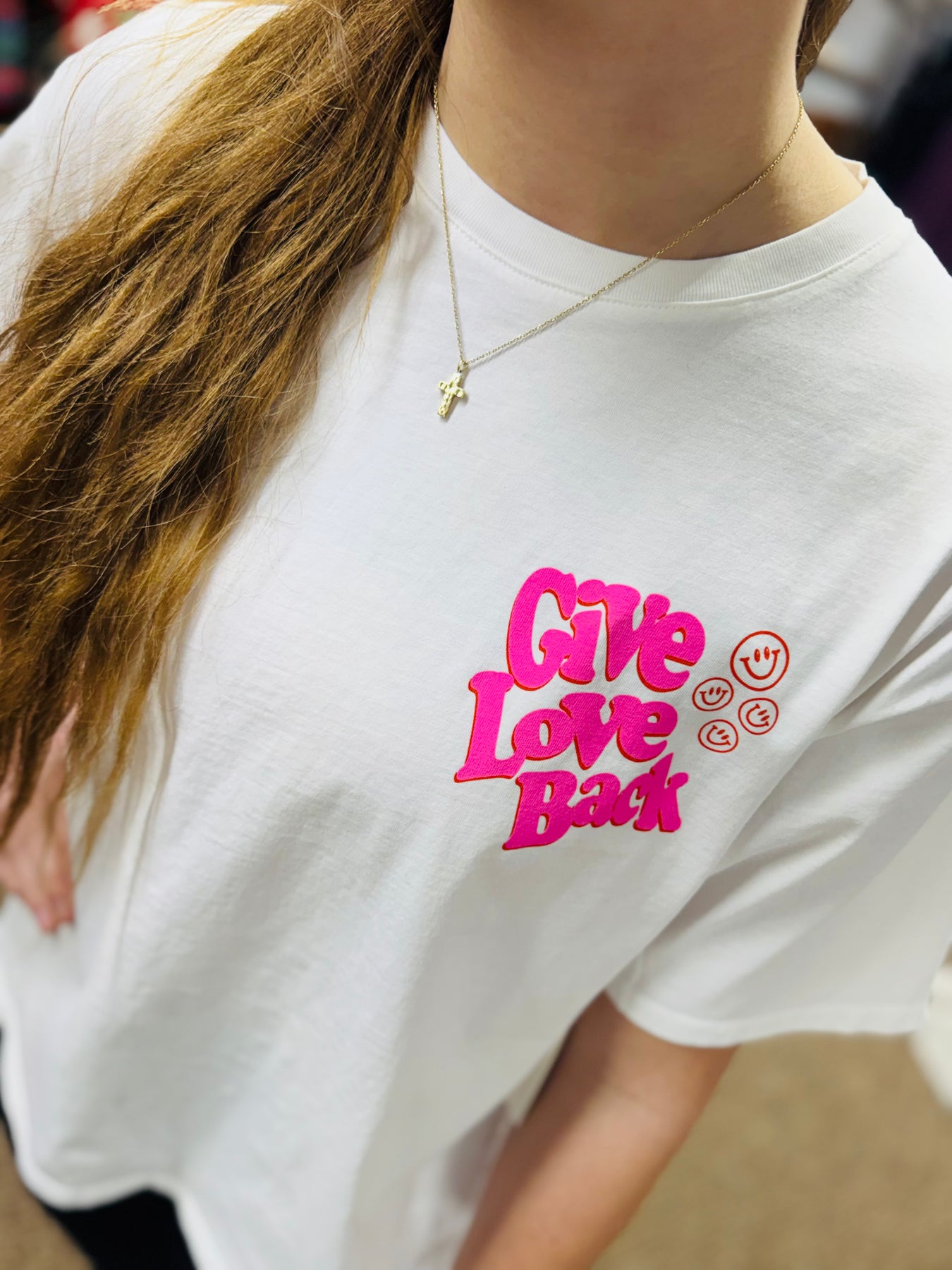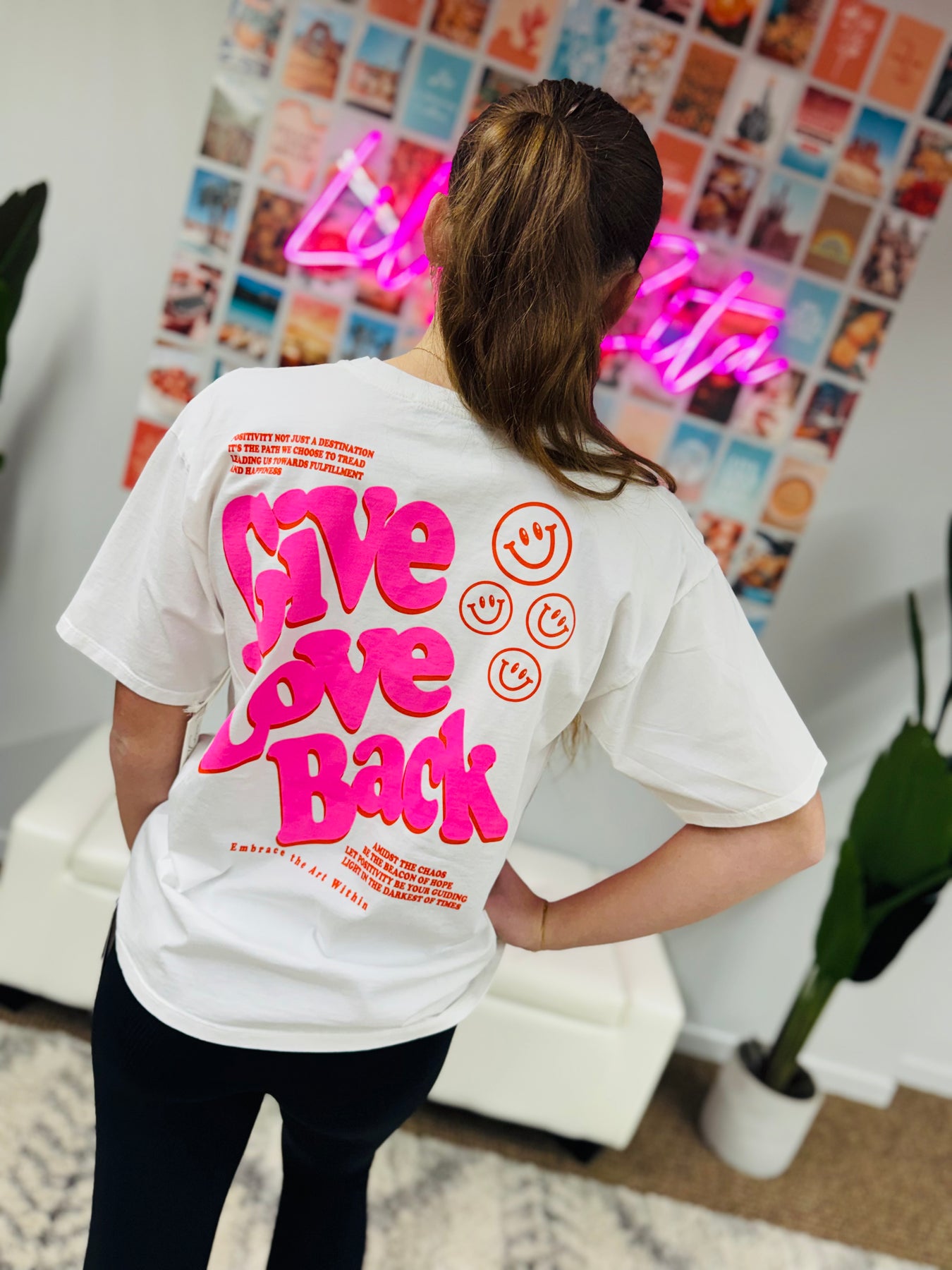 he Washed Graphic Tee Give Love Back offers a comfortable, lived-in feel thanks to its washed fabric. This tee combines casual style with a meaningful message, making it a versatile addition to your wardrobe that’s perfect for everyday wear.