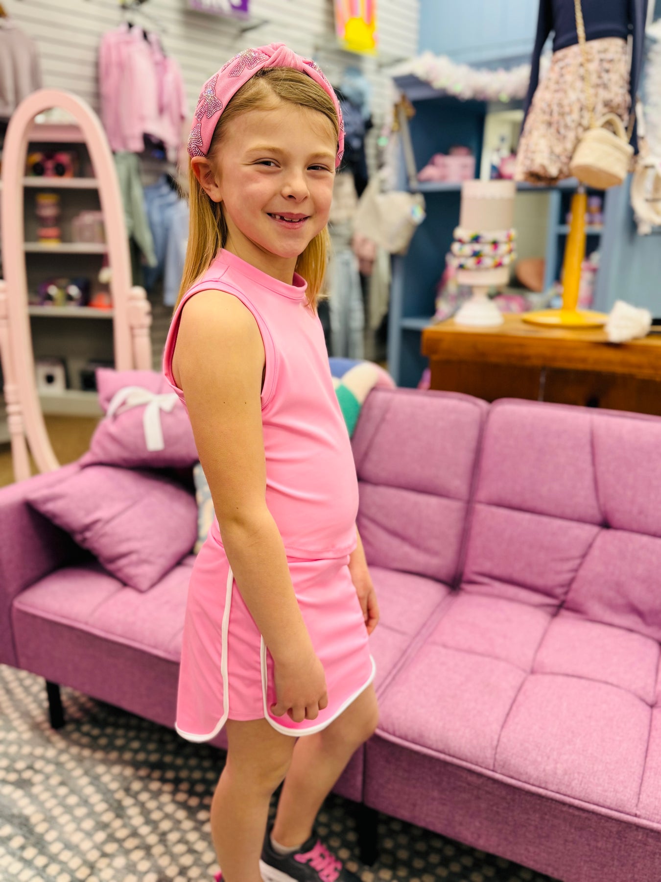 Elevate her active wardrobe with this adorable pink muscle tank—the perfect match for our bestselling Alo Yoga tennis skort. Designed for comfort and style, this lightweight tank moves with her through workouts, playdates, and weekend adventures. The fitted silhouette flatters while allowing full range of motion, making it ideal for yoga, tennis, or casual wear. Pair it with the coordinating skort for a coordinated look she'll love reaching for again and again.