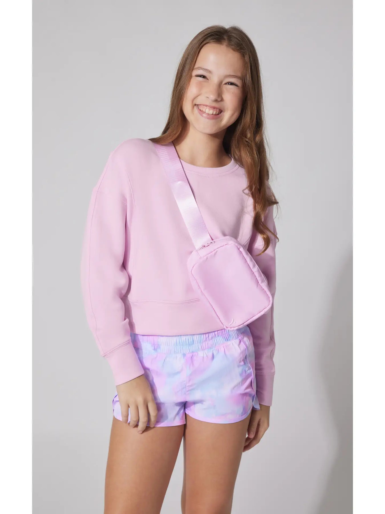 girls lavender zuri everyday pullover, woven short and bum bag set