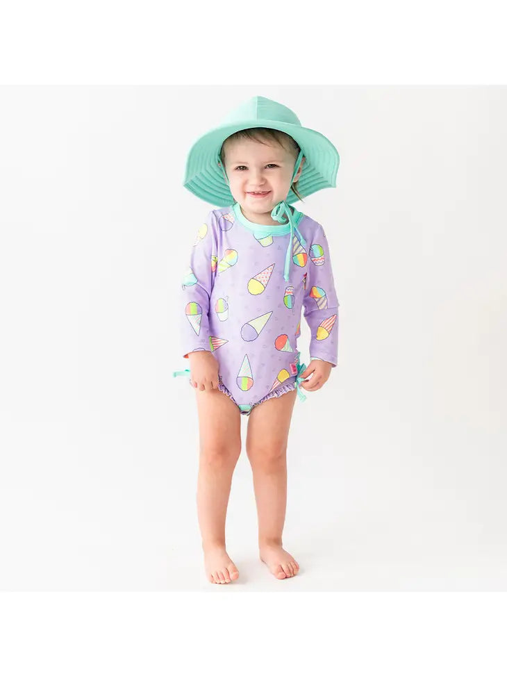A wonderful addition to your little girl's swimwear, this One Piece Rash Guard is comfort and style rolled into one. Snaps at bottom make for easy changing. Made with sun protected fabric for all day protection and comfort.