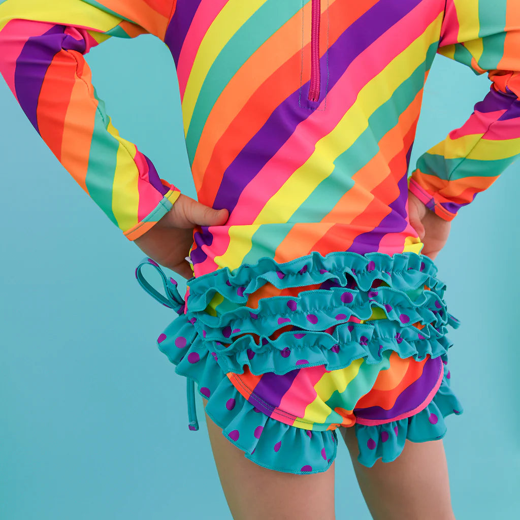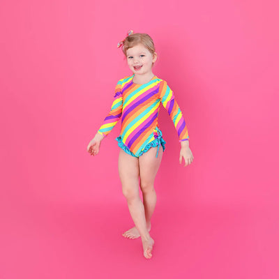 Long Sleeve Rash Guards are UPF 50 for sun safe play. Neon colors provide high visibility so you can spot your kiddos easily all summer long! Three functional snaps at the bottom of the suit in sizes 24m and under for easy diaper changes. Zipper along the back for easy on and off in all sizes. Adjustable ties at top of the leg opening can be tightened if needed. Runs slightly big - size down for tighter fit.