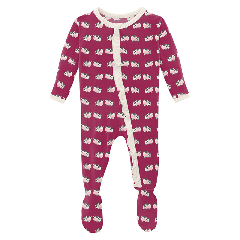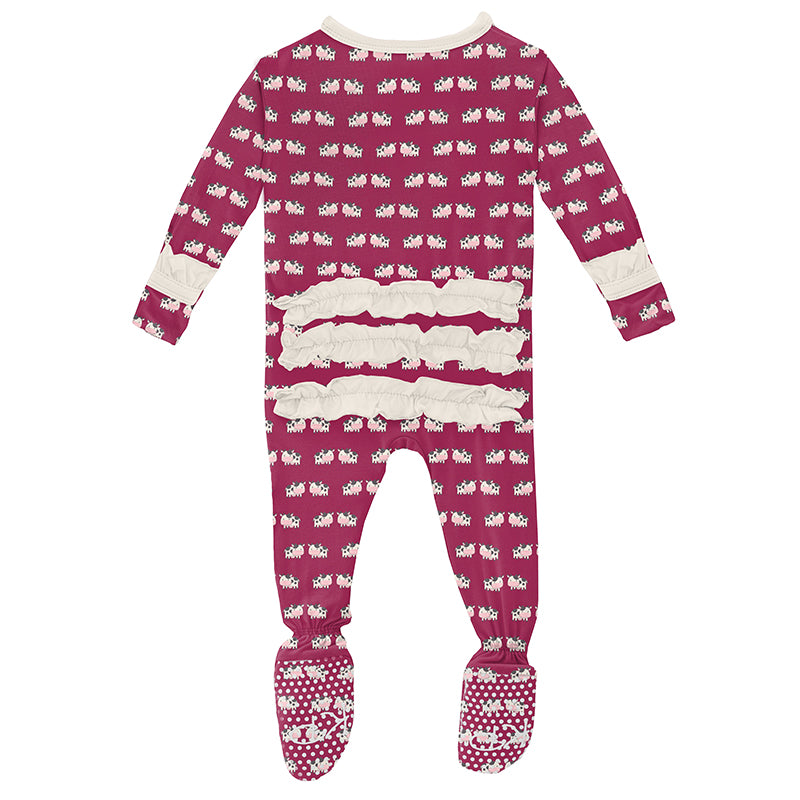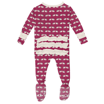 We took cuteness up a notch! Our traditional footie, with flip paws to cover chilly hands and prevent scratching, fleece on the inside feet, and no-slip grips on the outside feet, now has sweet ruffles along the front zipper and rear snaps. Perfect for your little princess!