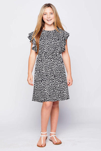 Kids Size Leopard poly spandex mini dress featuring round neck, ruffle sleeve and elastic waist line.