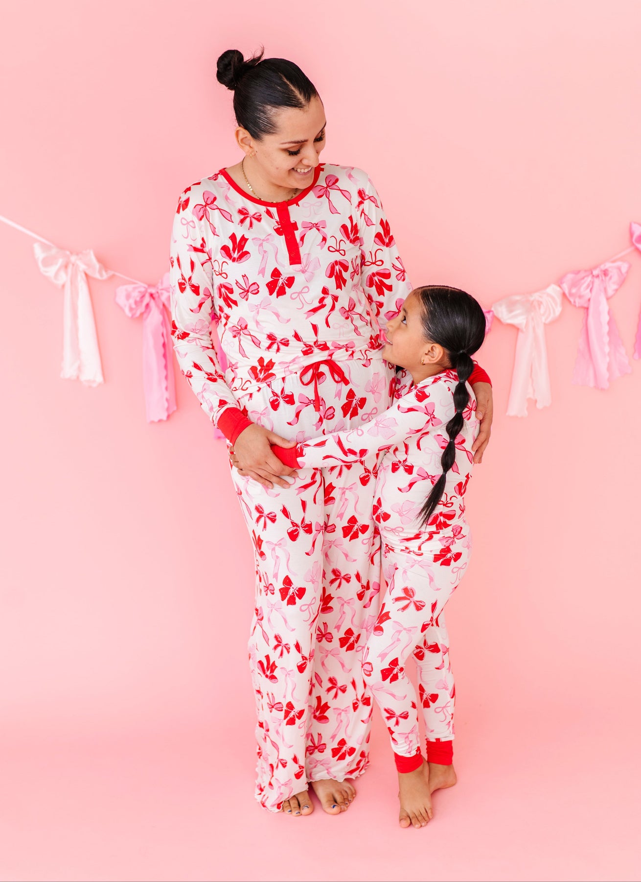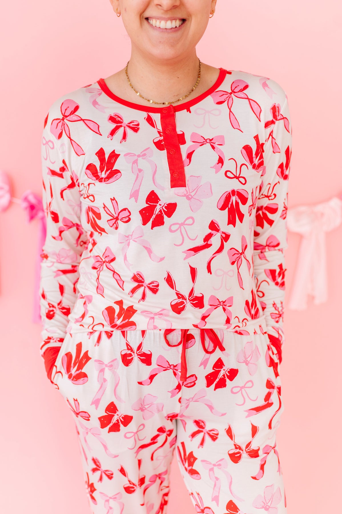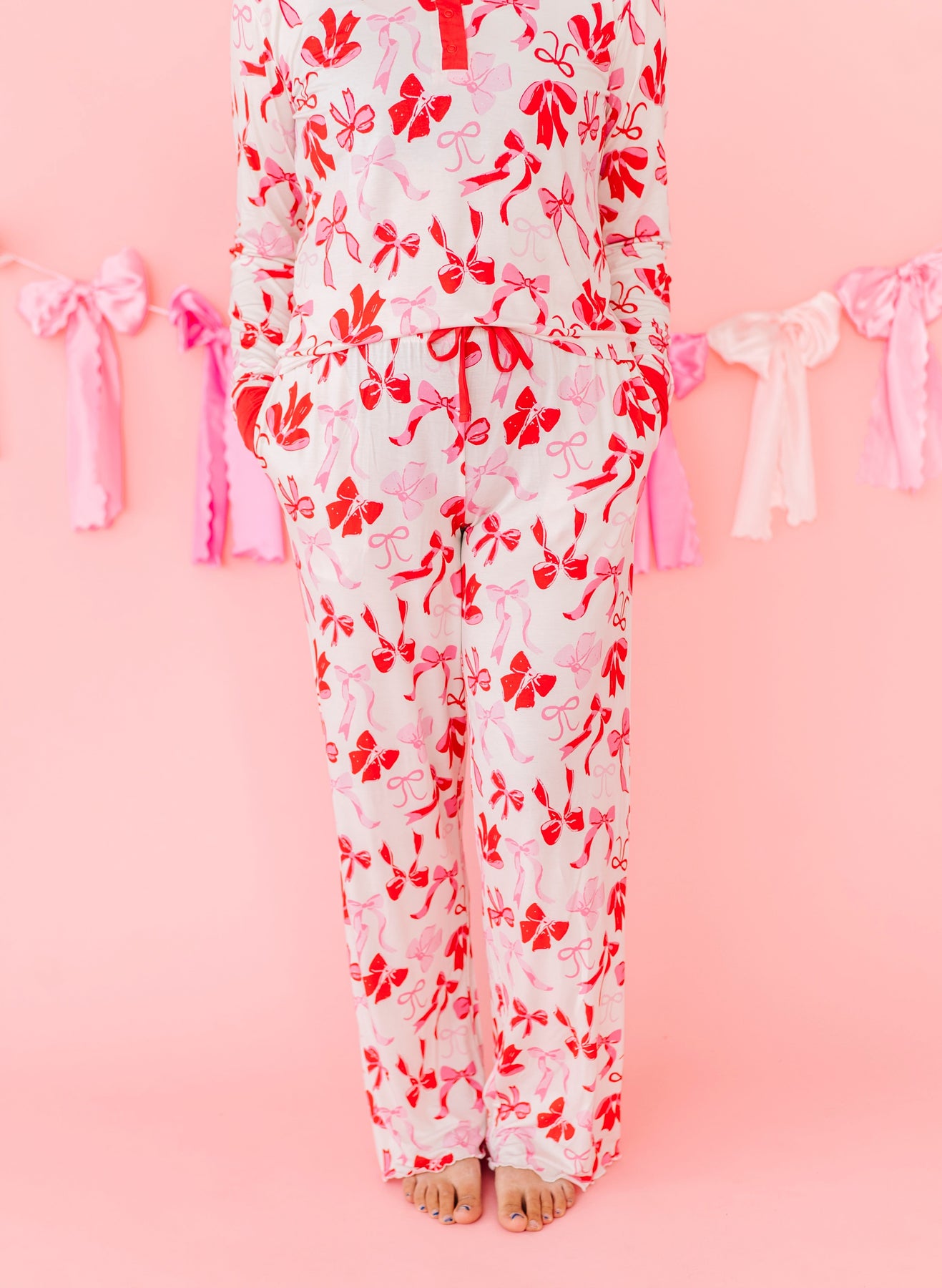 This set is the perfect mix of cozy comfort and pretty-in-pink charm. Featuring an allover bow print in shades of red and pink, this set feels playful, feminine, and made for slowing down. The classic long-sleeve top pairs effortlessly with relaxed-fit pants for a look that’s as cute as it is comfy. Whether you’re curling up on the couch, sipping your morning coffee, or matching with your minis. Made from our signature buttery-soft bamboo viscose blend, it’s breathable, stretchy, and gentle on skin for all-night (and all-day) comfort. Because lounging should feel just as good as it looks.