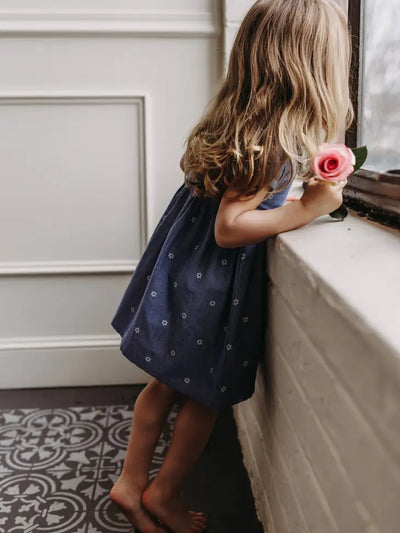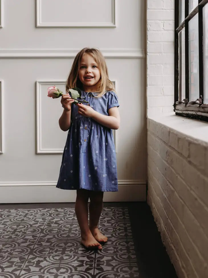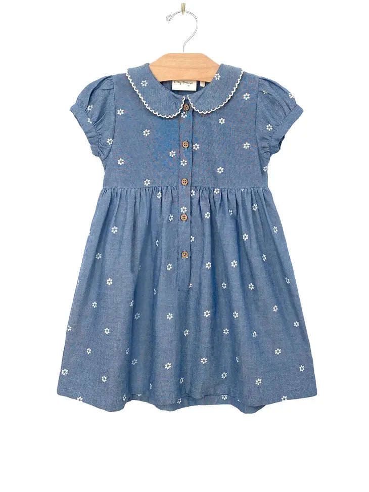 Made with 100% chambray cotton, this is a spin on one of our signature styles! Coconut buttons, all over Chambray Daisies print, and a soft voile collar with lace detailing.