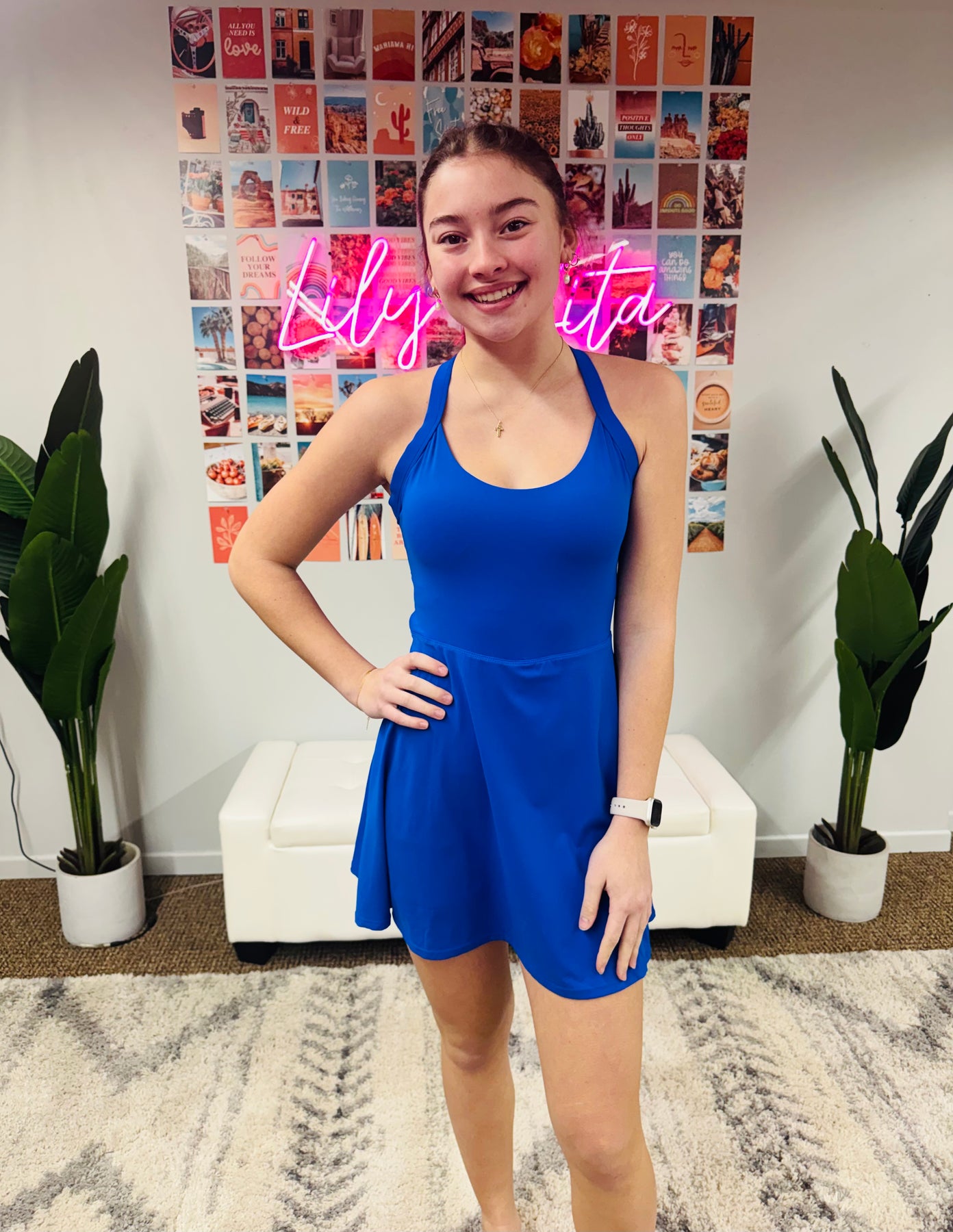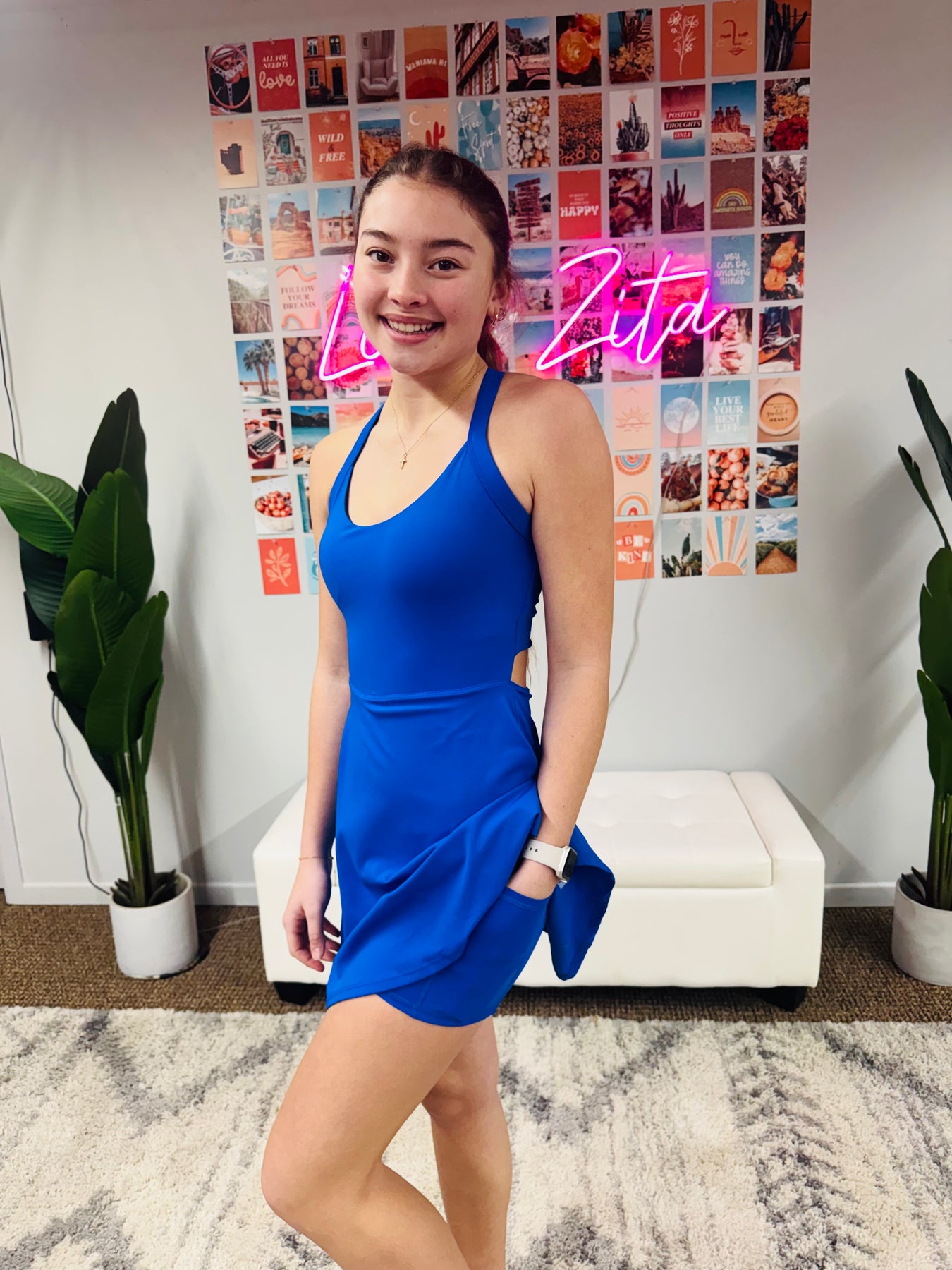 Stay active and stylish. Made from a recycled nylon/spandex blend for a sustainable and comfortable fit, this green A-line dress features a built-in bra for support, a twist-back with a sexy cut-out detail for a chic look, and a halter strap clasp trim to securely fasten the back strap. Designed with inside shorts, it's perfect for tennis, active wear, or a dynamic lifestyle. Embrace versatility and eco-friendly fashion with this must-have dress.