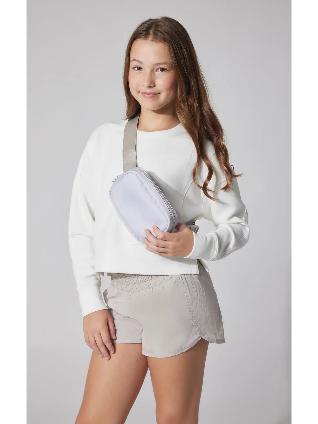 girls white dove zuri everyday pullover, woven short and bum bag set