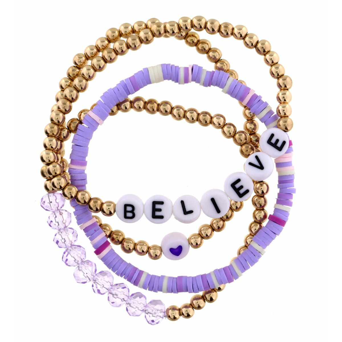 Kids Set of 4, Gold, Purple, White Beaded with "Believe" Bracelet