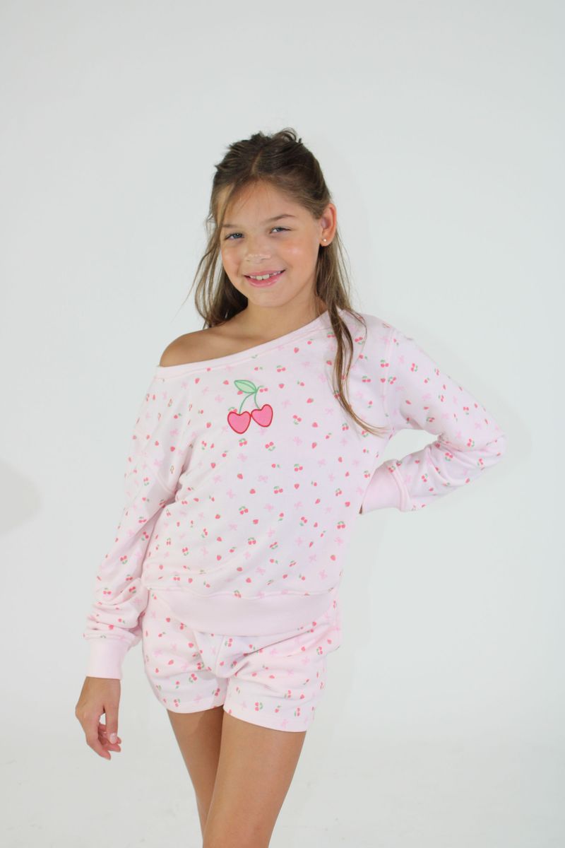 Tween girls Cotton poly/French terry sweatshirt adorned with cherries and bows all over and featuring the phrase "Living Proof Of A Loving God" in puff print on the back.