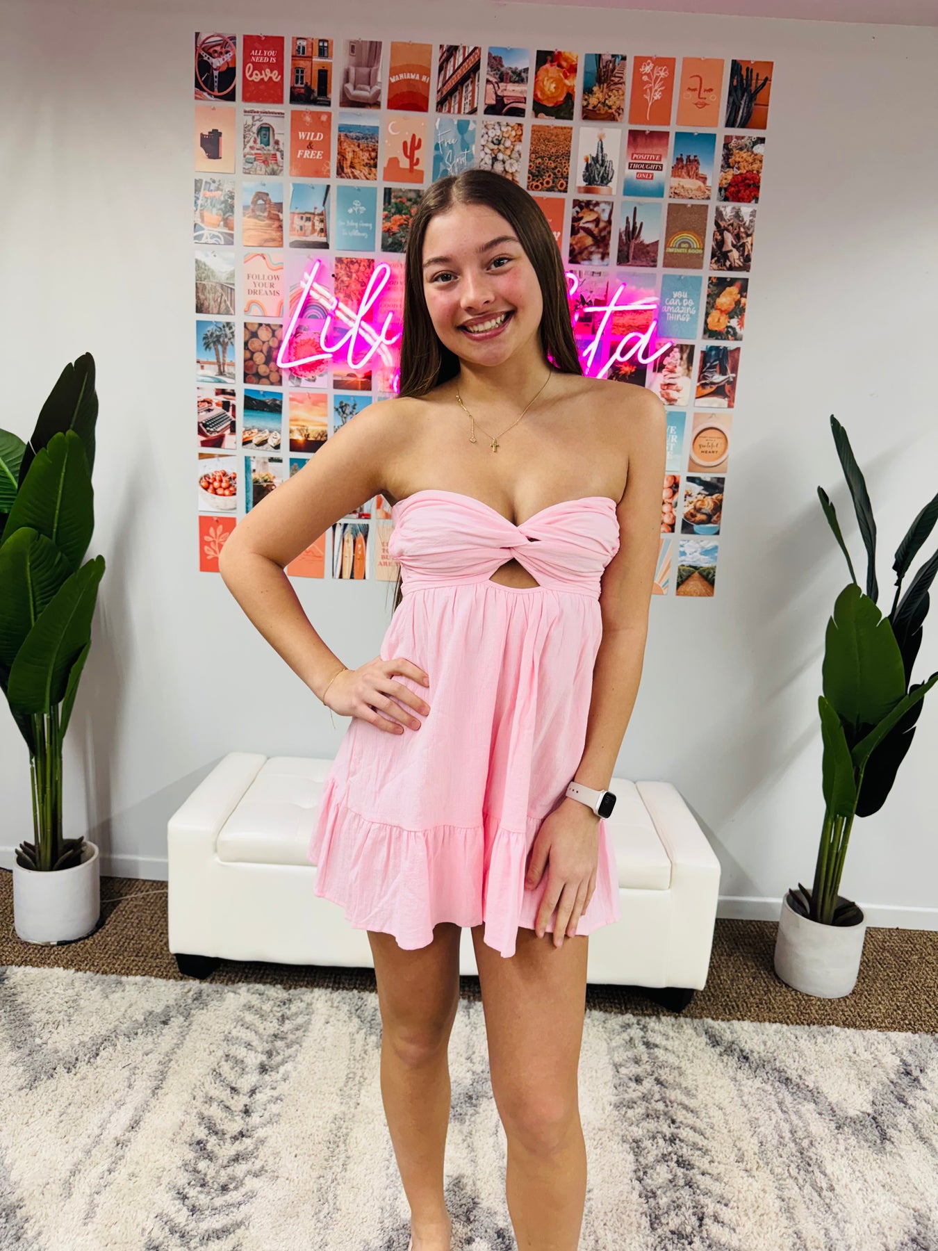 soft pink cotton strapless mini dress