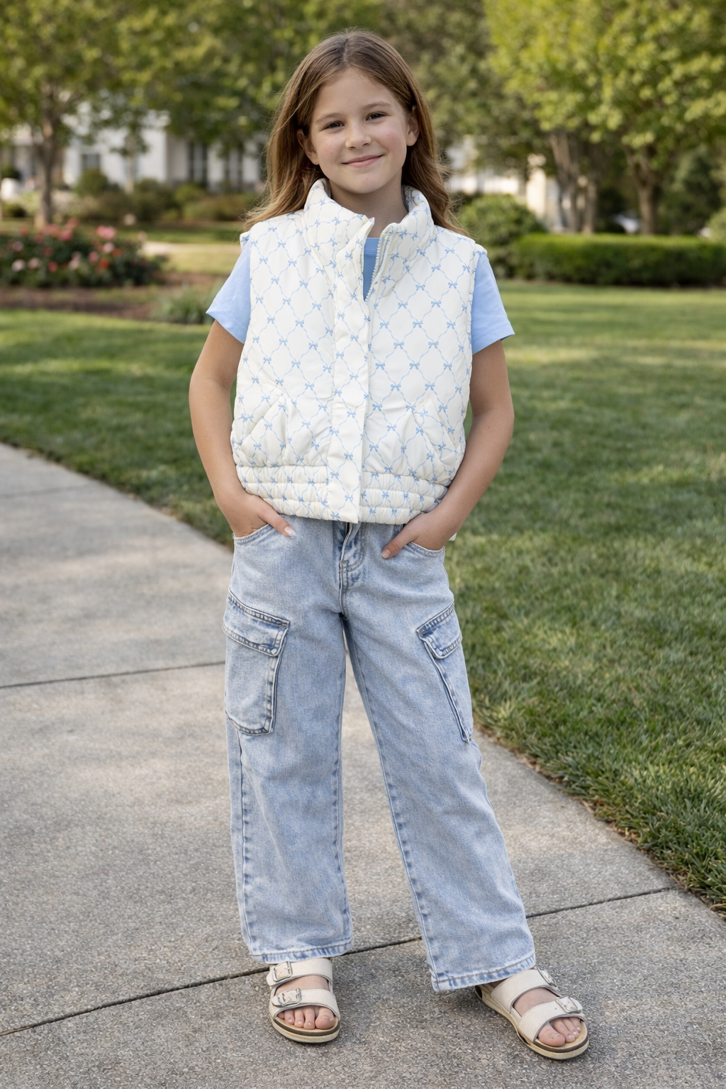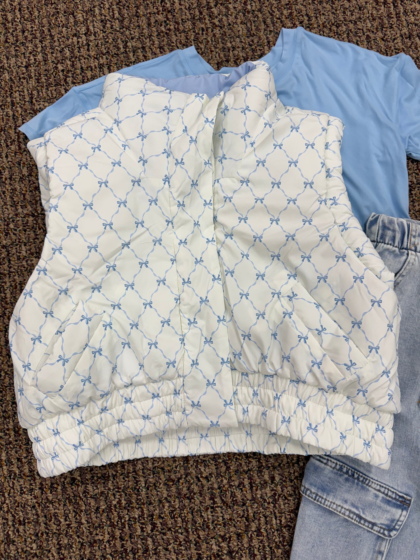 This reversible padded vest is a spring wardrobe win! One side features a cheerful blue and white bow print that adds a pop of personality, while the flip side offers a versatile solid option for mixing and matching. The lightweight padding provides just-right warmth for breezy spring days without the bulk. Perfect for layering over tees and hoodies or throwing on for outdoor adventures. She'll love having two looks in one piece—and you'll love how easy it makes getting dressed!