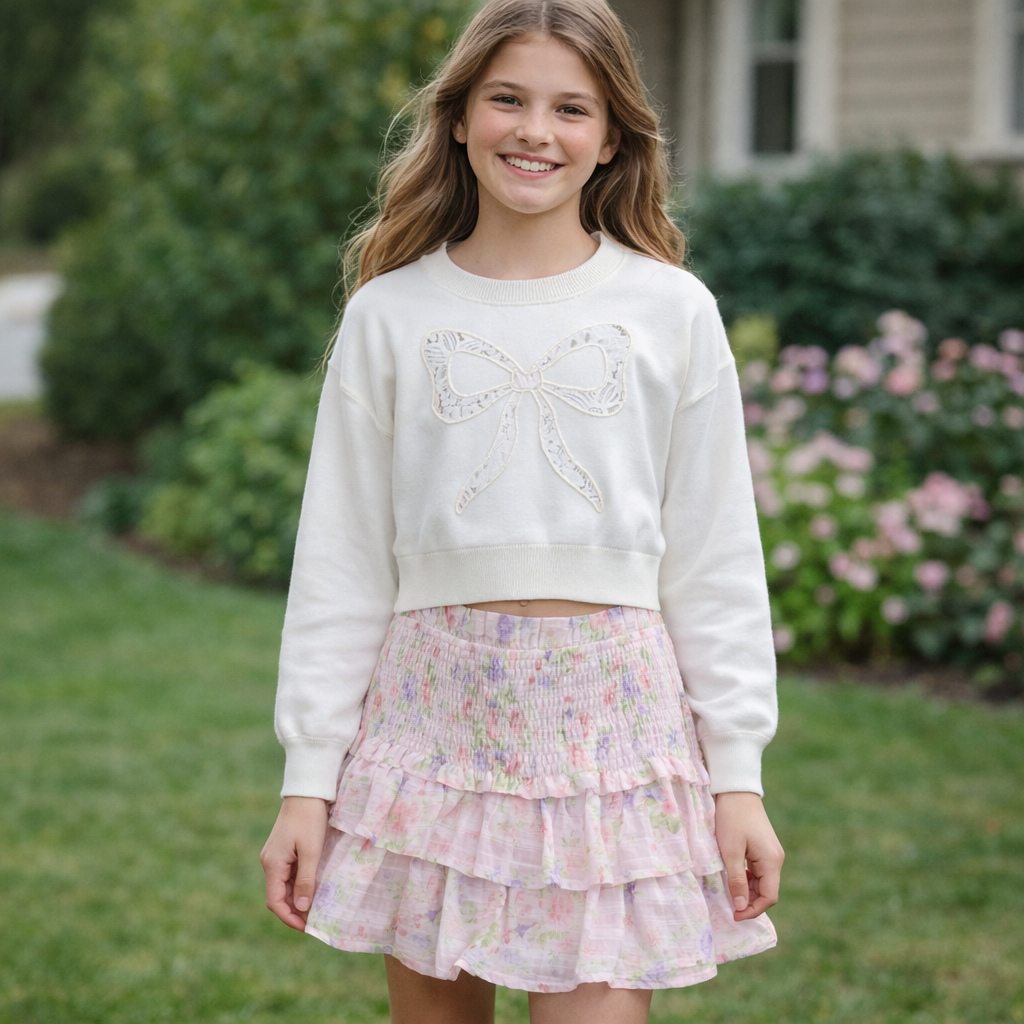 White bow lace cropped sweater perfect for spring styling. This charming piece features delicate lace detailing and a sweet bow accent that adds playful elegance to any tween wardrobe. The cropped silhouette pairs effortlessly with high-waisted skirts, jeans, or layered looks for a fresh, on-trend appearance. Lightweight and versatile, it's an ideal layering piece for mild weather transitions. Great for school, casual outings, or seasonal photo moments.